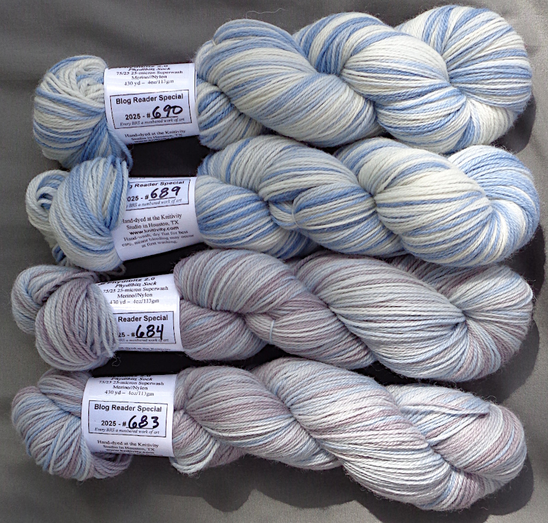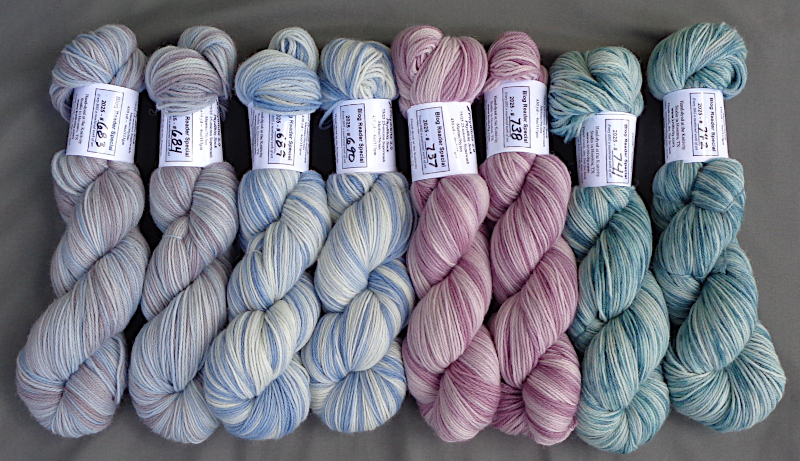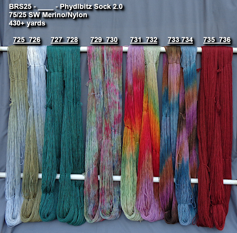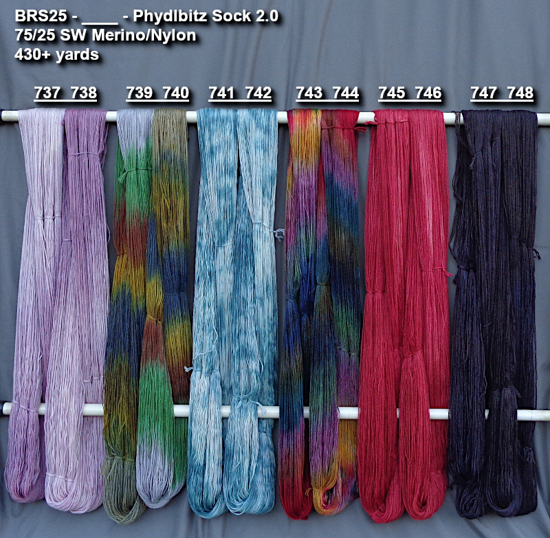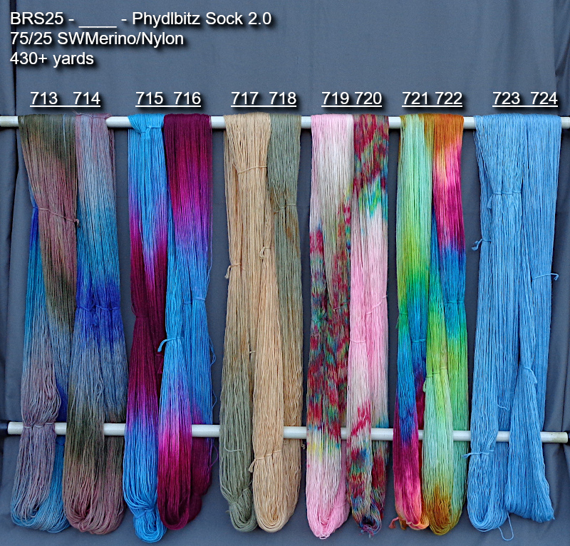 These are all dyed on Phydlbitz Sock 2.0 (75/25 blend of 25-micron superwash Merino/Nylon, 430+ yards.