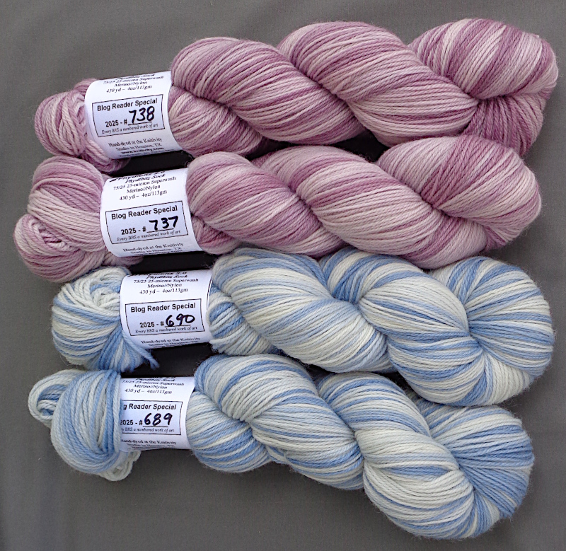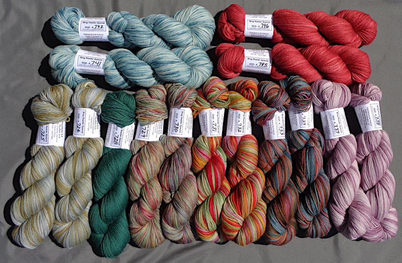 To claim the ones you want just send me an email with your selections noted. I’ll send you a PayPal invoice which will also include shipping inside the U.S. If you are outside the U.S., please let me know so I can calculate the rate to your country. I am aware that international shipping may be a challenge at this time for reasons for beyond my control, so I will understand if you aren’t comfortable ordering yarns at the moment.