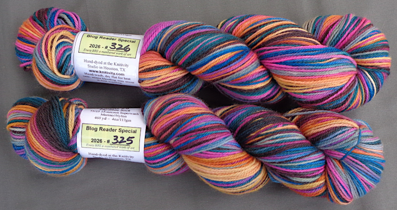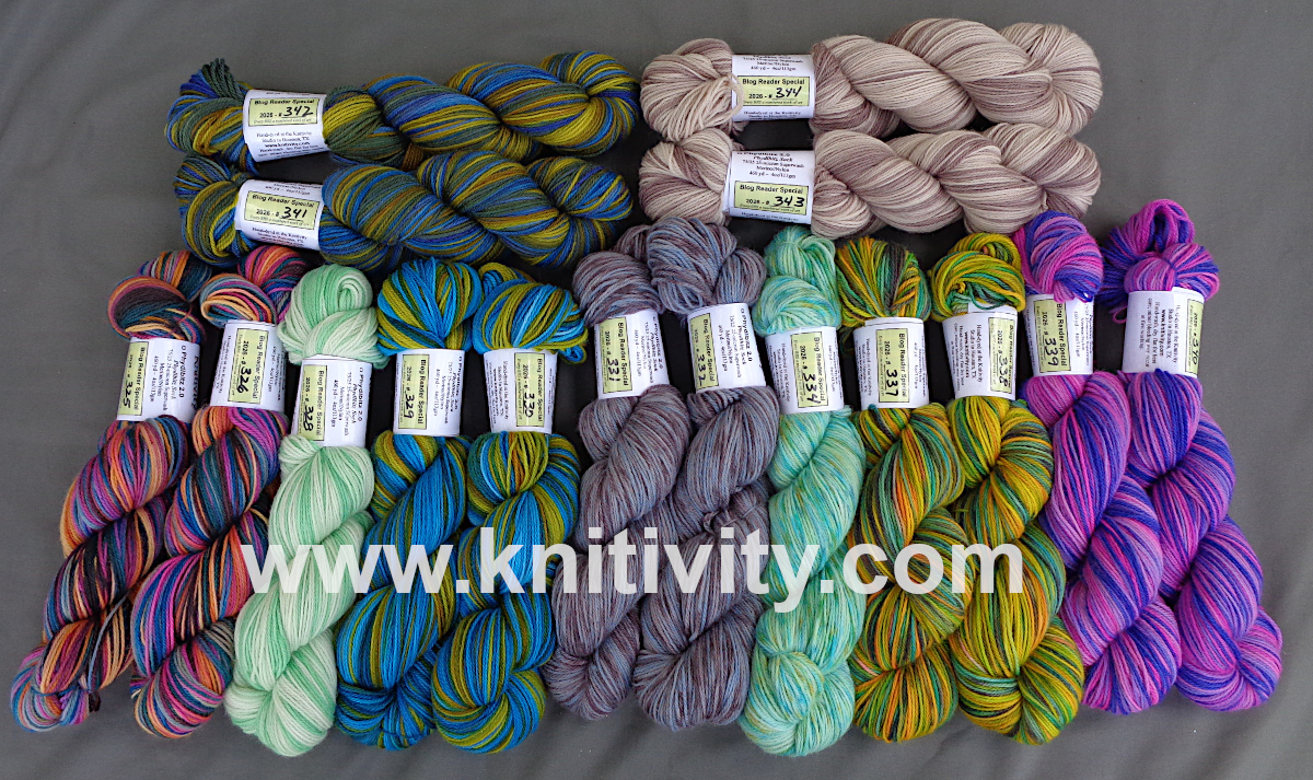 These are all Phydlbitz Sock 2.0 — 75/25 Superwash 25-micron Merino/Nylon, 460 yards. These are normally $28.00 each, but for Saturday and Sunday, you may claim any two or more from this week’s collection (#195 – 218) for just $26.00 each skein. They will all be reskeined for shipping, of course, but I like to offer this Preview Pricing discount because I don’t have to photograph the reskeined yarns or edit and post those image on the Blog Reader Specials page. Claiming yarns from the rack saves me a little work, so I’m happy to save you a little money. Win-win!