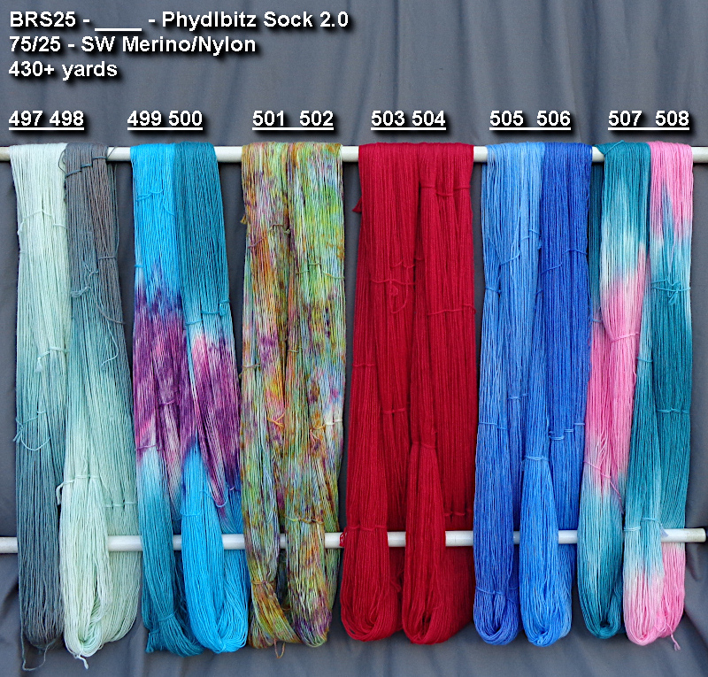 These are 75/25 Superwash 25-micron Merino/Nylon, and will be $27.50 when they land on the Blog Reader Specials page. For Sunday and Monday, however, you can take any two or more skeins from this week’s collection – #485-508 for just $26.00 each.