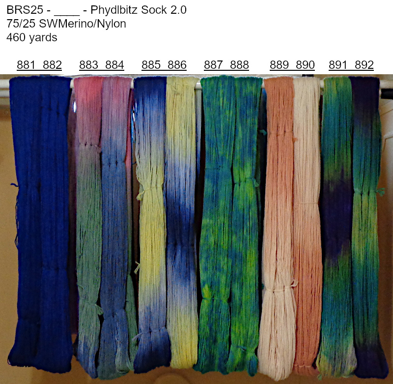 All of these are on Phydlbitz Sock 2.0 (75/25 Superwash 25-micron Merino/Nylon, 460 yards) and are normally $28.00 each. For Monday and Tuesday, visitors are invited to claim any matching Twinset for just $26.00 each.